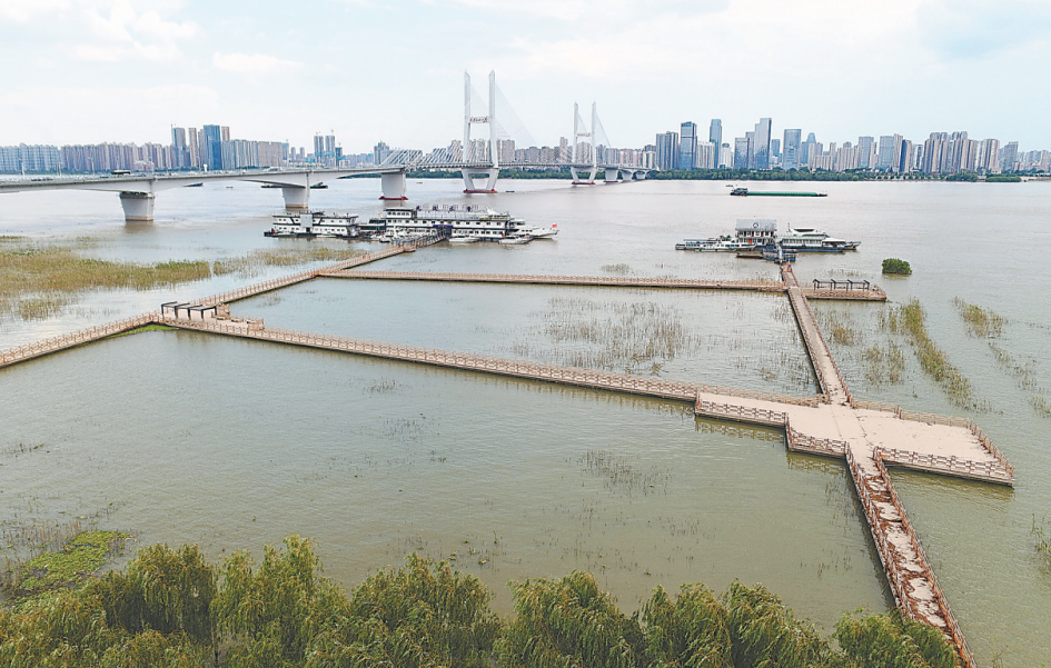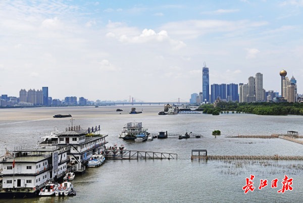 长江武汉段水位持续回落 芦花栈道“浮”出水面