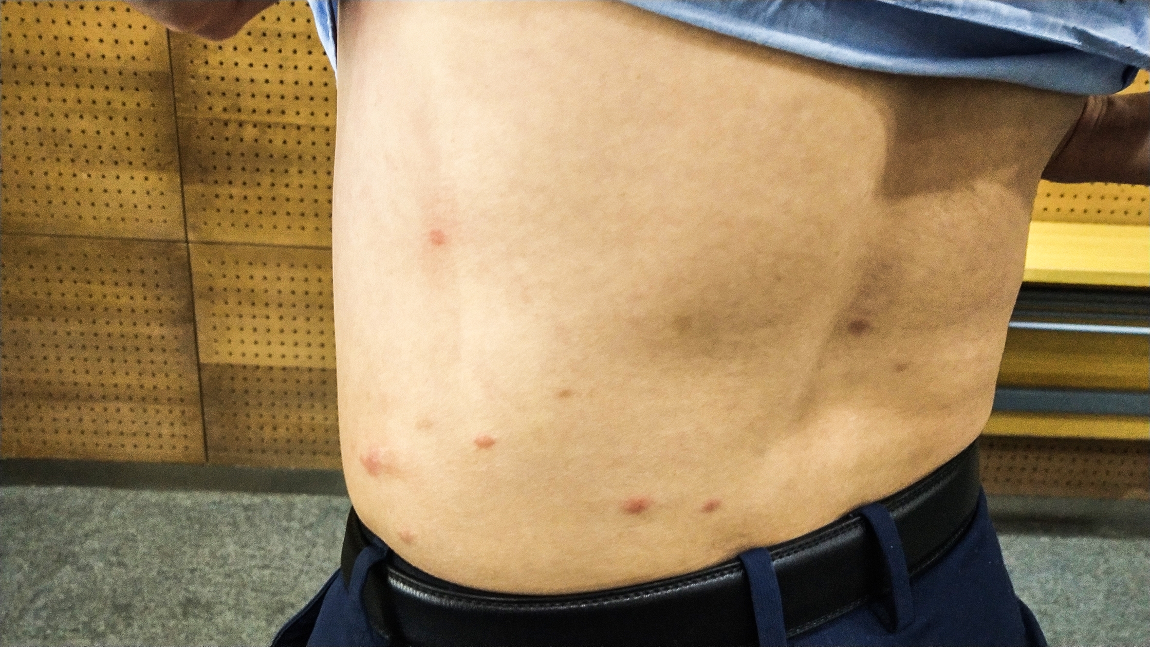 工作人员身上到处都是被跳蚤咬后留下的红色丘疹