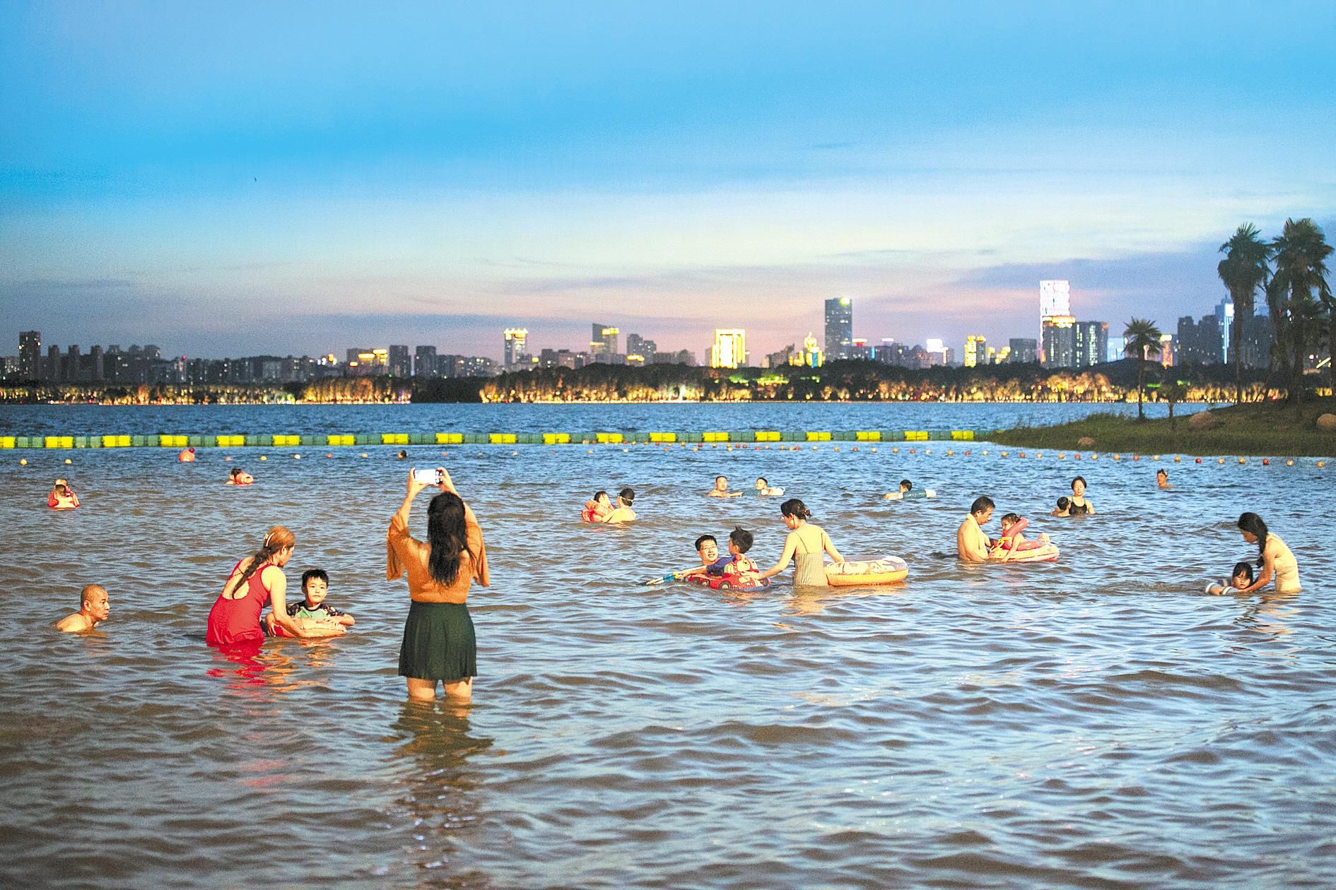 8月13日傍晚,市民在武汉东湖沙滩浴场浅水区域戏水纳凉。位于武汉东湖风景区内的沙滩浴场2015年为保障东湖隧道施工暂停营业,时隔5年,于今年7月底再次开放。(湖北日报全媒记者 柯皓 实习生 张蒙萌 摄)