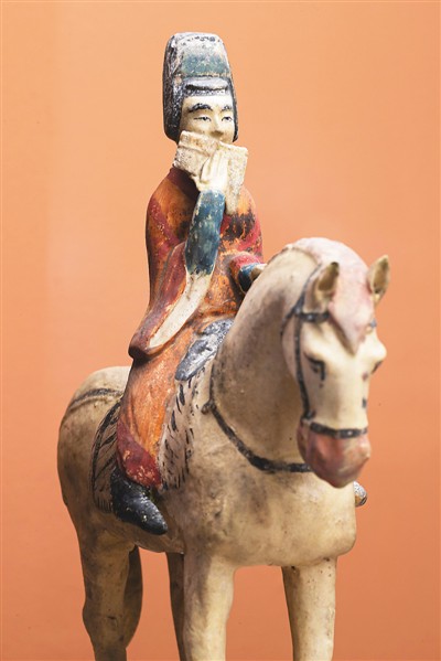 展览中还有不少乐俑,生动再现了古代演奏乐器的情景。西安插秧村唐墓出土的一组乐俑,为6名男子组成的乐队。乐俑均着圆领袍、裹幞头、系腰带,面颊丰满,盘坐或跪坐演奏,所执乐器有竖箜篌、拍板、横笛、排箫、琵琶和笙。李贞墓出土的三彩骑马乐俑,造型生动逼真,釉色鲜艳,人物手持乐器包括排箫、铜钹、鼓槌等。专家介绍,考古发现的隋唐乐舞俑数量很多,风格自成一体。其乐器的组合、形制、种类和数量,乐人的服饰、发式、造型、神情和演奏姿态,均体现了一个时代的风貌。
