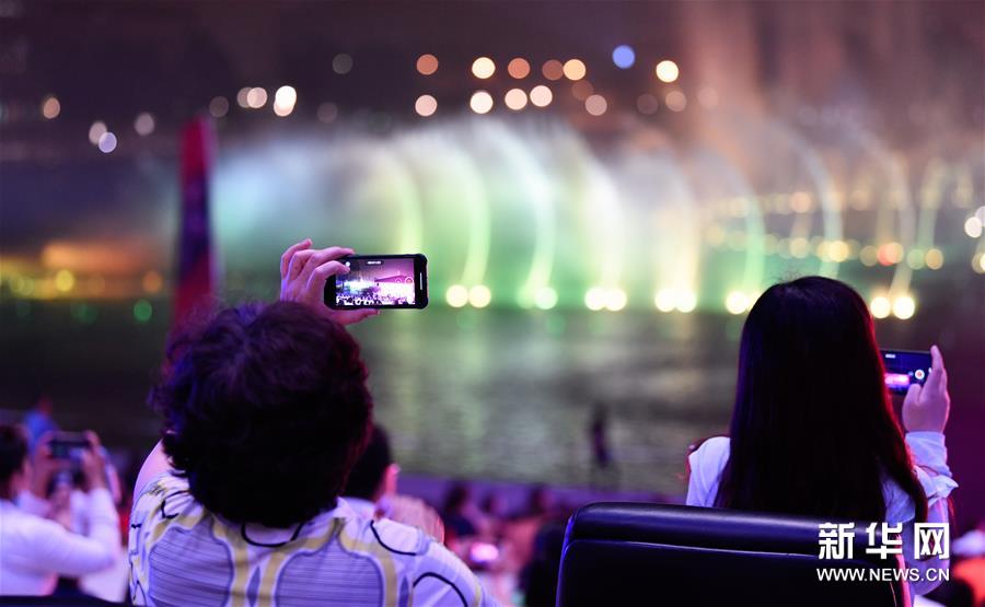 8月17日,在天津大剧院平台剧场,观众在听音乐会的同时欣赏喷泉表演。新华社发(孙凡越摄)