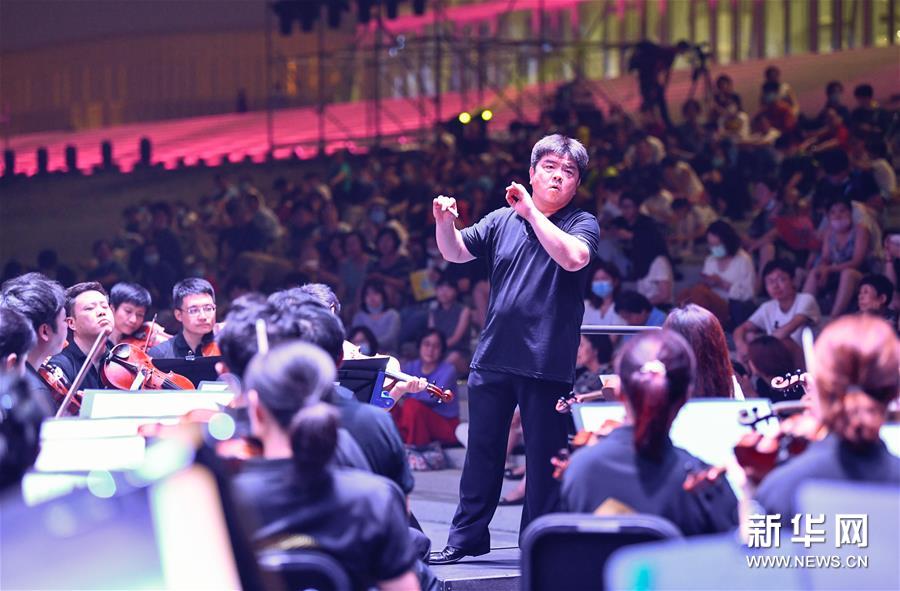8月17日,在天津大剧院平台剧场,指挥家李飚在指挥乐团演奏。新华社发(孙凡越摄)