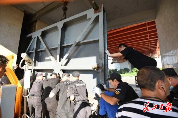 7时许,钢闸门被完全推入左侧空间。“不要忘记把闸门放下来。”夏浩一边提醒同事,一边清理闸门外摞了七八层的白色沙袋,让出一条路来。