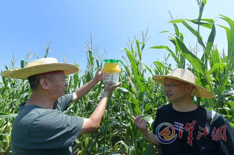 8月17日,在樊城区牛首镇黄丰村,植保专家在查看用生物食诱剂防治水稻玉米虫害的效果。目前,我市率先在全省运用这项生物防治新技术,已经初见成效。