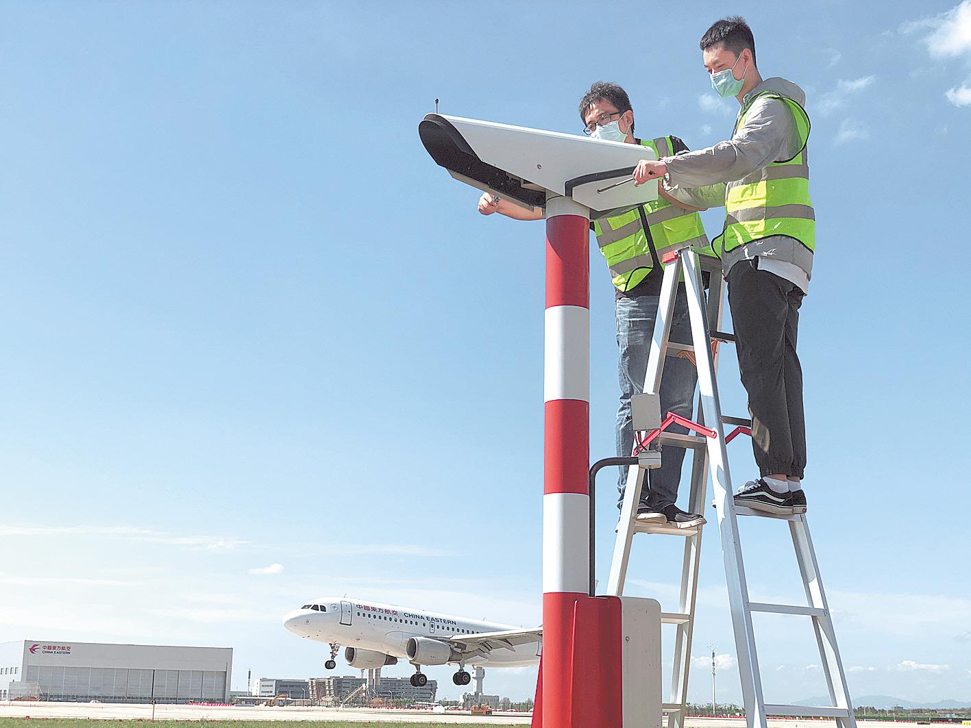 胡鹏和王冠雄熟练地爬上辅助梯,打开设备盖板,检查镜头是否洁净、风机运行是否正常、线路接口是否牢固,以及查看为解决鸟类干扰数据安装的防护网。不时有飞机轰鸣着从他们背后安全降落。