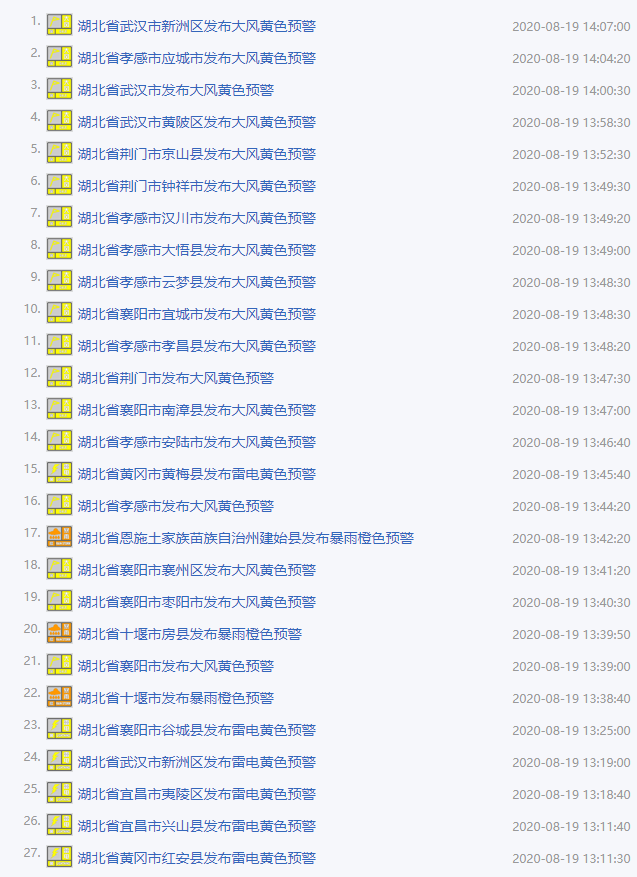大风、雷电、暴雨……湖北发布63条预警信号,涉及武汉、孝感、荆门等多地