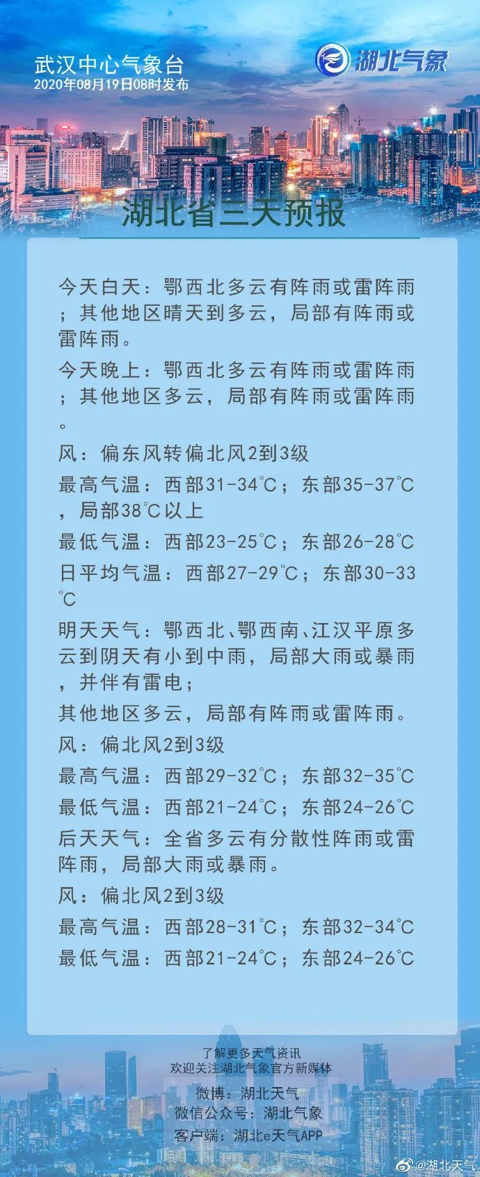 后天,全省多云有阵雨或雷阵雨,局部大雨或暴雨。在雨水的影响下,气温出现下滑,后天东部最高气温在32-34℃,西部部分地区还不足30℃!