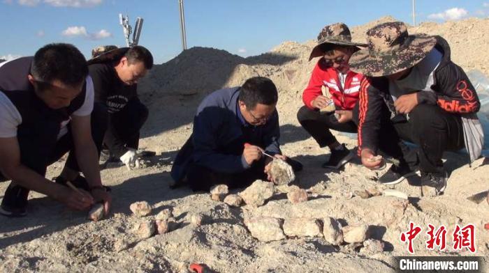图为王军有(图左三)进行化石挖掘清理工作。 陈峰 摄