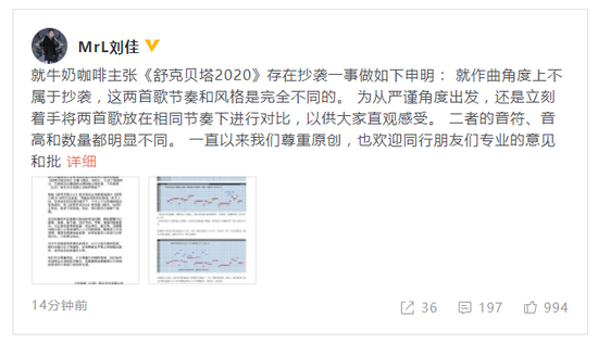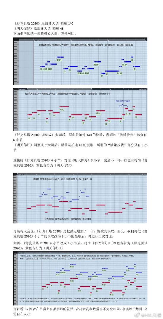 网易娱乐8月19日报道 何洛洛方回应新歌涉嫌抄袭一事后,《舒克贝塔2020》作曲者、制作人刘佳发声明否认抄袭牛奶咖啡的《明天,你好》,并晒出歌曲对比,称“两者在节奏上有明显差异,音符音高和数量也不同”,表示己方充分尊重原创,也愿意就此事与牛奶咖啡进行良好的沟通。