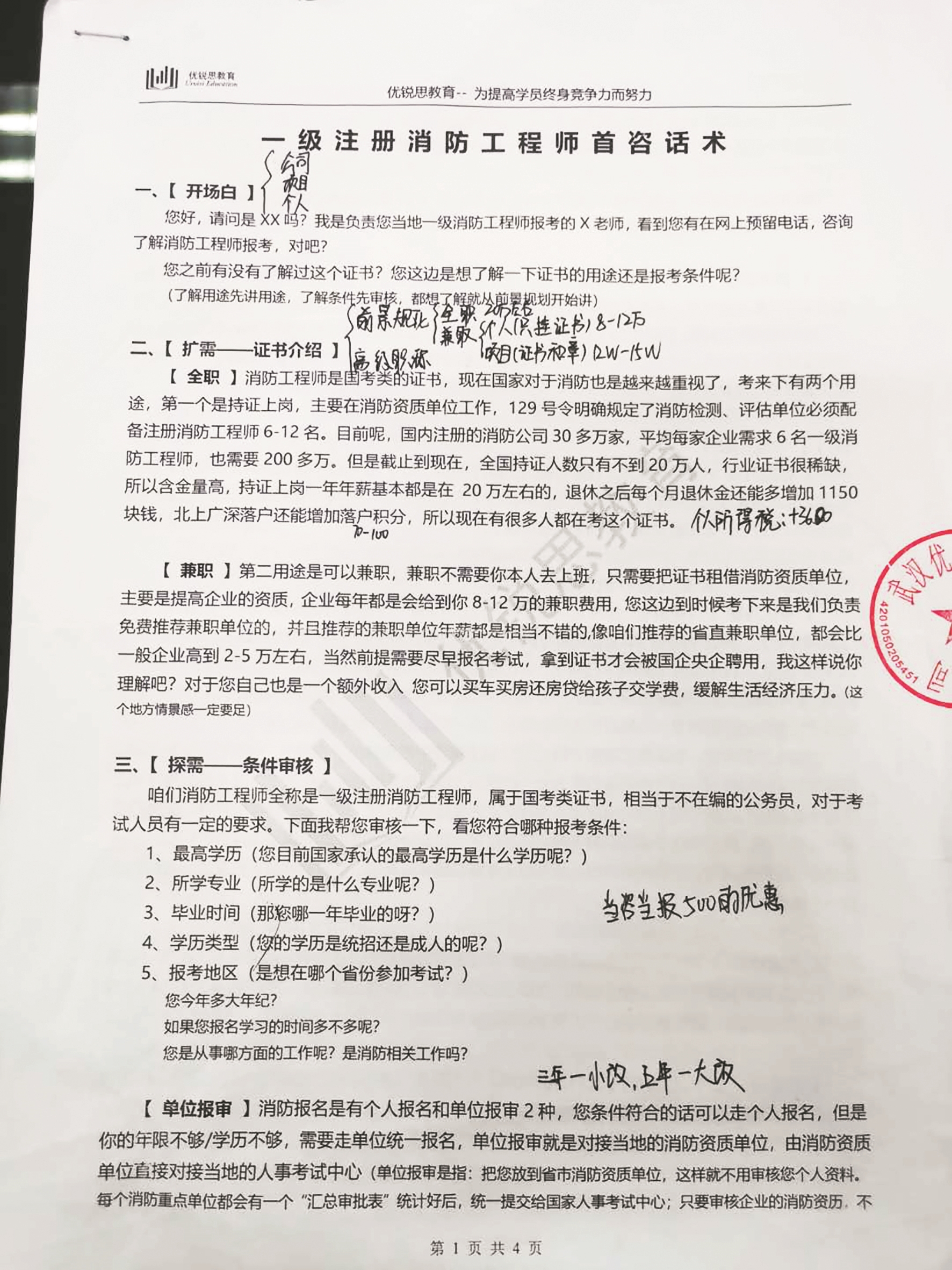 记者在现场也看到了一份《一级注册消防工程师首咨话术》。这份《话术》详解了如何让潜在学员在短时间内缴费开课学习的套路。它从开场白、证书前景介绍、探寻对方需求、报名方式等方面,根据对方不同的要求早已设置好了相应的回答内容。