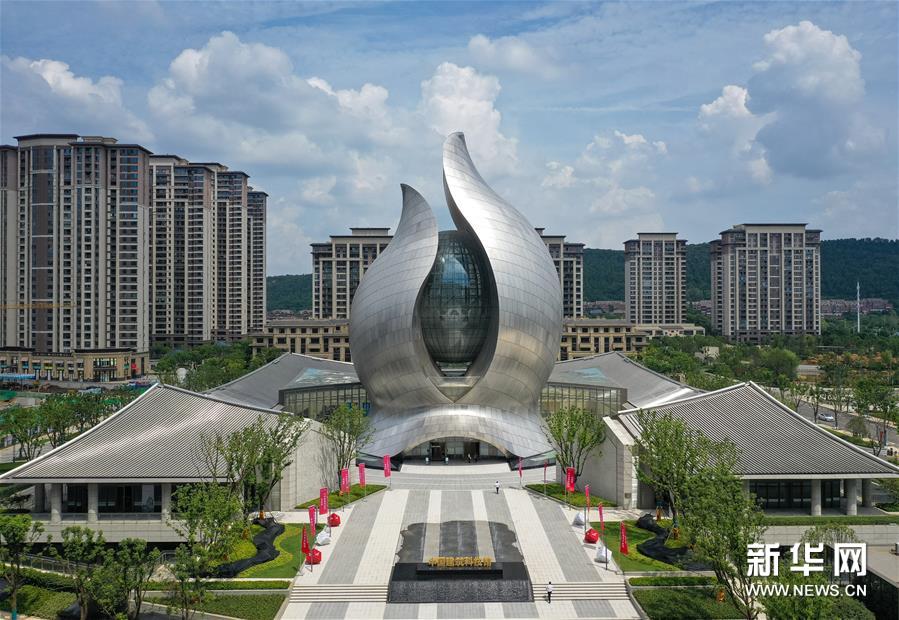 8月19日拍摄的中国建筑科技馆(无人机照片)。当日,国内首家以建筑科技为主题的展馆——中国建筑科技馆在武汉开馆。展馆建筑面积1.9万平方米,采取预约制参观,游客提前一天预约。在开馆当天,“火神山、雷神山医院建设纪实展览”也在此开展。新华社记者 肖艺九 摄