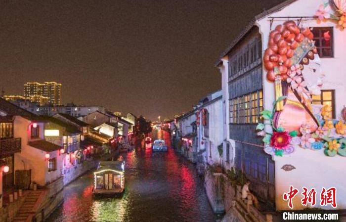 江苏无锡千年古运河上,游客们乘坐画舫游览欣赏沿途如画夜景。(资料图) 泱波 摄