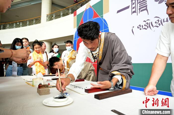 图为藏族艺术家用竹笔书写藏文书法。 俞靖 摄