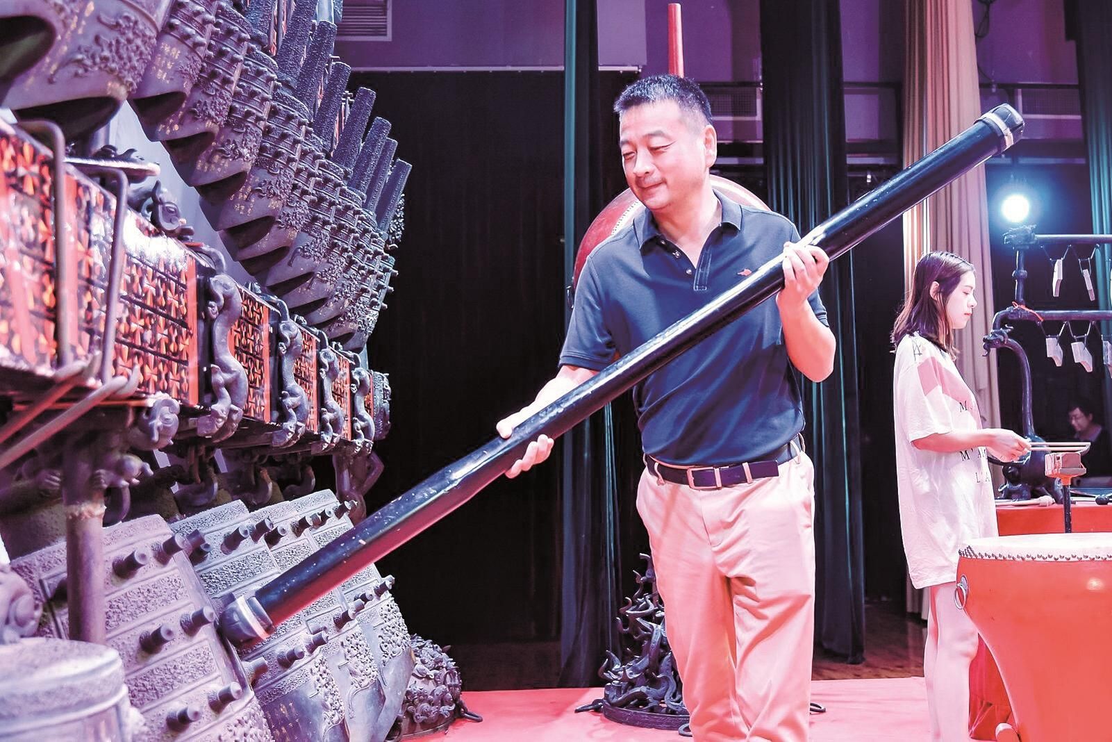 梁建章在湖北省博物馆体验编钟