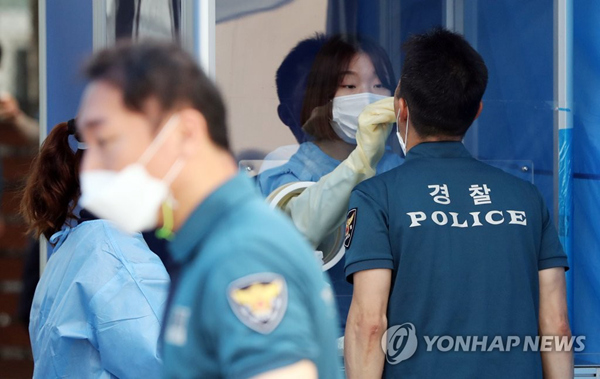 8月19日,在首尔地方警察厅机动本部的筛查点,曾维持光复节集会秩序的警员接受新冠病毒检测。 图源:韩联社