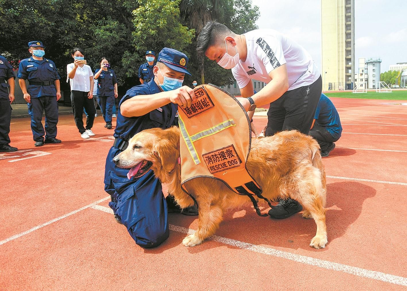 武汉市消防救援支队特勤大队搜救犬站位于江夏区藏龙岛。21日上午,该站特意为搜救犬举办退役仪式,其中包括3只明星搜救犬:金毛巡回猎犬“图图”、史宾格猎犬“渴望”与“维尼”,它们都是2011年底搜救犬站建站时的第一批成员。