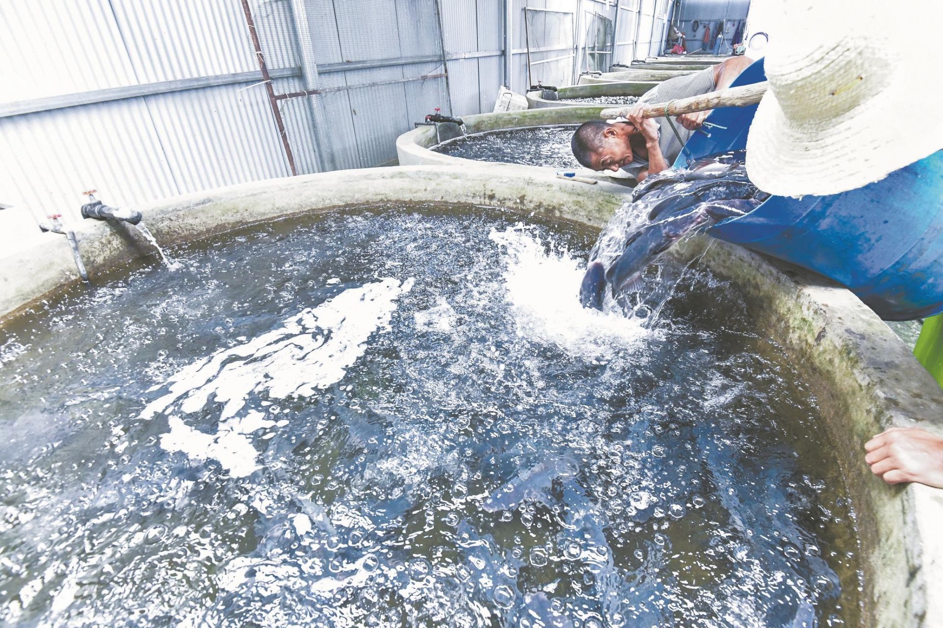 工人们把等待配送的鱼儿转入圈养池