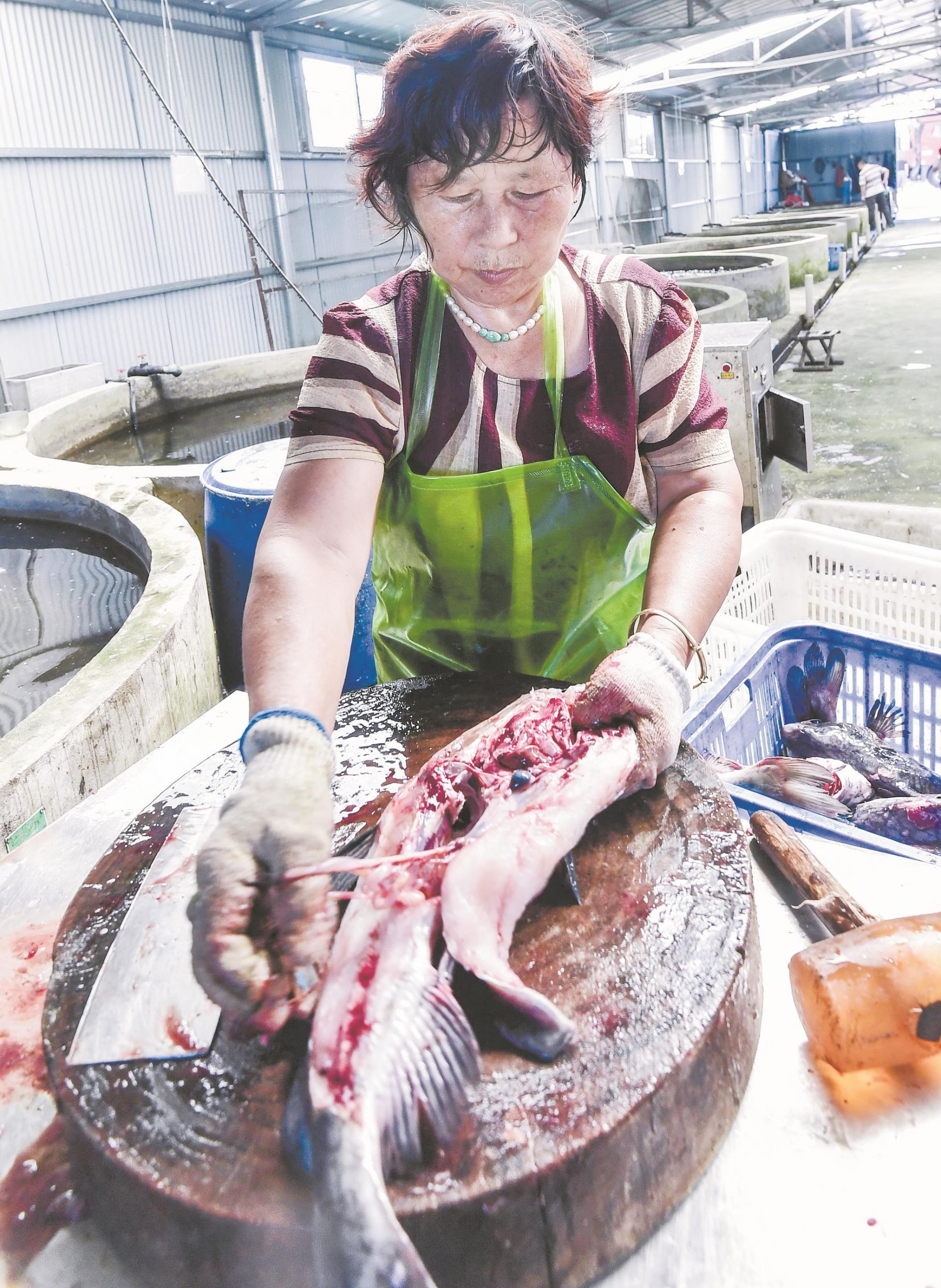 靠近暂养池的一片区域,一名工人正在宰杀一批刚刚起水的肥鱼。“订单配送的时间确定之后,我们就会开始加工。”工人说。