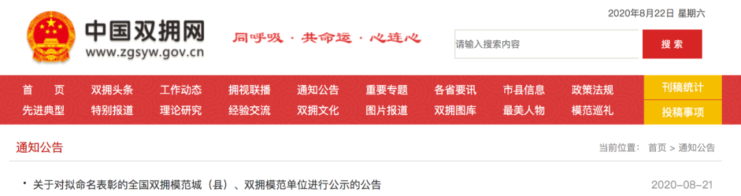 8月21日,全国双拥工作领导小组办公室发布:关于对拟命名表彰的全国双拥模范城(县)、双拥模范单位、拟表彰的全国双拥模范个人名单进行公示的公告。