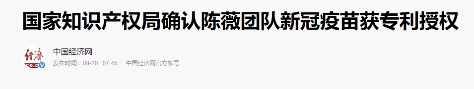 8月19日,国家知识产权局确认,有关“军科院军事医学研究院陈薇院士团队及康希诺生物联合申报的新冠疫苗专利申请已被授予专利权”的情况属实。该发明专利申请享有优先审查政策。