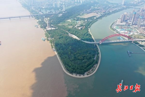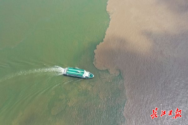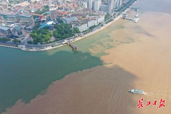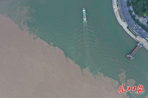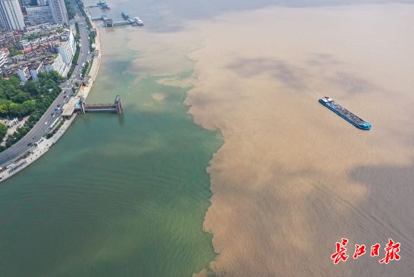 长江网8月23日讯武汉的南岸嘴是长江和汉江的交汇处,由于涨水,长江水含沙量较高,呈现浊黄色,而汉江的含沙量较少,显得碧波荡漾。2020年8月23日,记者通过无人机看到,两江交汇后在江面形成一绿一黄的纹理界线,两江口出现“泾渭分明”的水上景观。 (记者彭年 摄影报道)