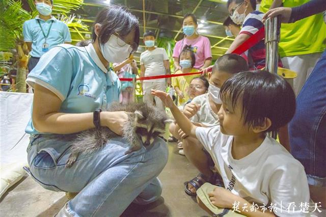 保育员们给四只小浣熊幼仔准备了空心树洞。有时,游客会看见毛茸茸的幼崽,探头探脑地在展区里面闲逛,非常可爱。也有幸运游客和小浣熊合影留念。