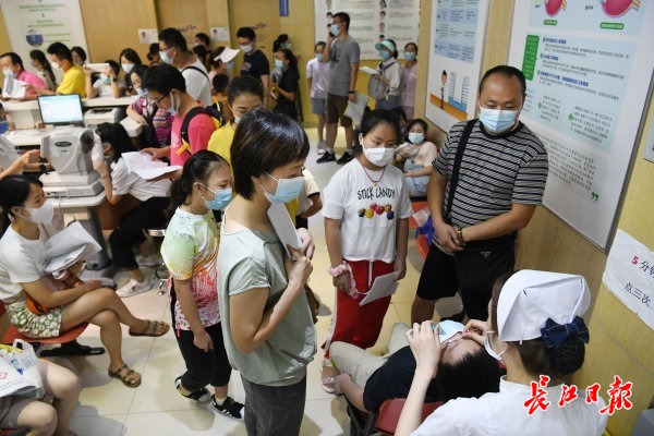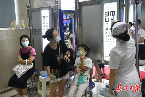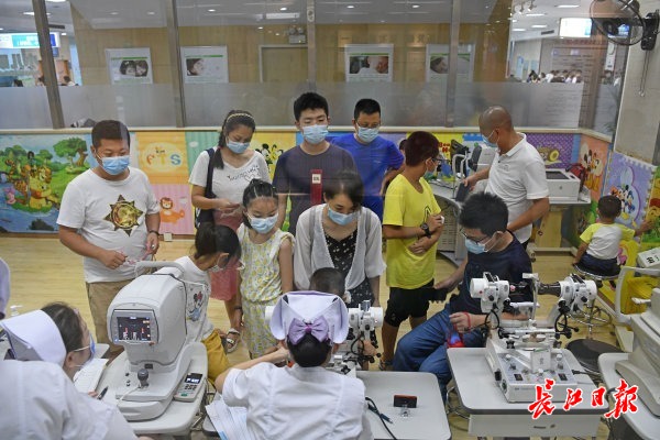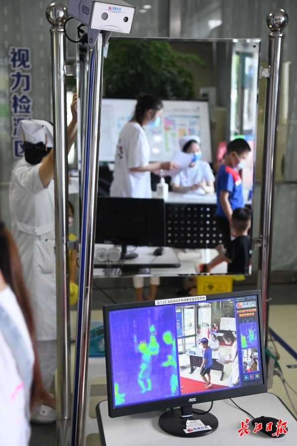 长江网8月23日讯 2020年8月23日,武昌大东门一家眼科医院,门口的红外测温仪忙个不停,不少家长带着即将开学的孩子前来测视力、配眼镜。近期,为满足患者看病需求,该院专门增设周末专家门诊,患者可错峰就诊,选择合适的就诊时间。专家提醒,儿童青少年如果发现看东西模糊,应尽快到正规医院进行散瞳验光,检查到底是假性近视还是真性近视。
