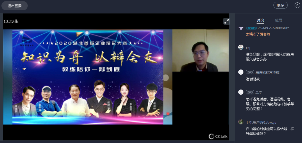 8月21日19:30-20:45,由湖北省图书馆、湖北省演讲协会、楚商联合会共同举办的e海悦读“知识为舟,共渡时艰”2020湖北首届企业辩论大赛第三期培训在CCtalk湖北省图书馆阅读直播间线上开讲。澳大利亚莫纳什大学商科硕士,世界排名第十的莫纳什辩论队主力辩手,曾任江汉大学辩论队队长和学生教练,并被多所学校和企业聘为特约辩论教练的胡睿鹏老师为我们奉上了《自由辩的战术安排与转场》。