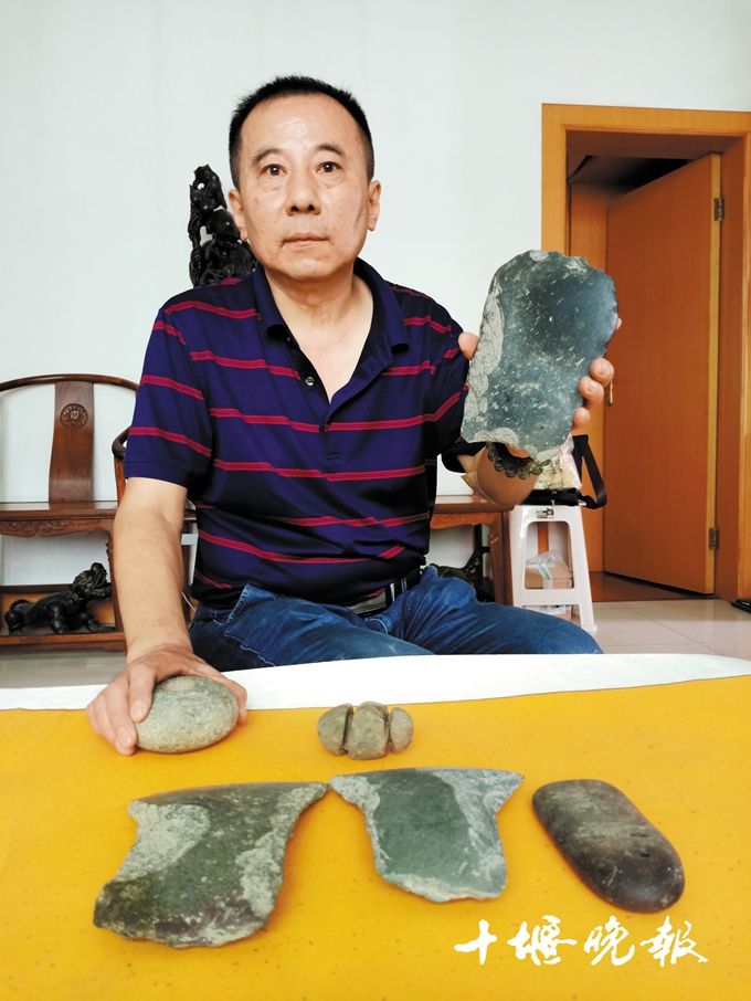 近日,记者走进张海鹰的家里,只见茶几上摆满石块。记者看到,这些石块大小不一,形状各异。有的石块从外形看,很像斧头;有的石块为圆形,中间还有一个孔。“这些石块是我收集的石器中,比较珍贵的品种。”张海鹰说,这些形如斧头的石块,名叫石斧。圆形带孔的石块,名为套纺轮。“这些石块都是远古时期十堰地区古人类使用的工具,石斧用来砸东西,套纺轮则是用来打野兽。”