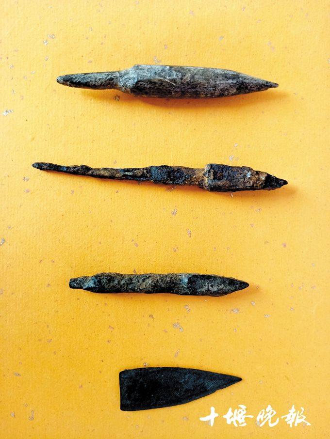 除了这枚石箭头,张海鹰还收集到了铁箭头、铜箭头、石箭头,和骨箭头组成一个“四件套”。记者看到,经历岁月洗礼,铜箭头和铁箭头已经明显腐蚀。“这四件物品都是十堰出土的,骨箭头是用动物的骨头打磨成的,年代也比较久远。”张海鹰说,古人类能把骨头做成箭头,说明当时他们很能干,特别是用石头磨成箭头形状,显示出了当时古人类的聪慧。