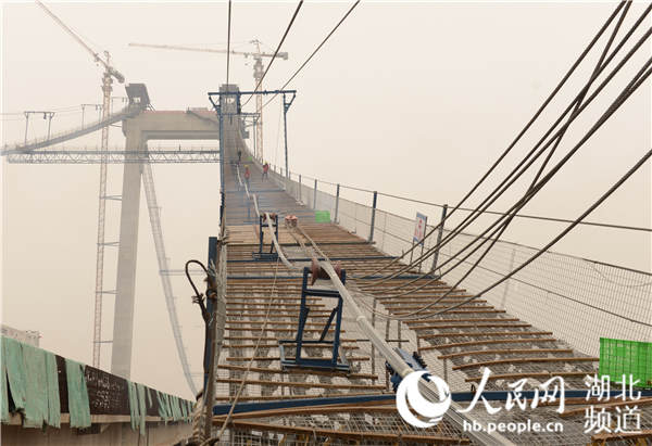 基准索股架设完成后,为了保证精度,还需进行连续三天的观测,基准索股的架设精度也达到最高水平。接下来的索股均按照与基准索股的相对竖直距离进行架设,测量均在晚上进行,由于在江风的影响下,索股时刻晃动,测量人员要长时间等待并多次测量后才能确定数据,需要有很强的耐心和体力。“就这样上下游总共338股索股,一股一股架设上去,我们用于架设索股的工作平台猫道还真的天天站着一群夜猫子在架设索股。”湖北路桥总工焦长青感叹。