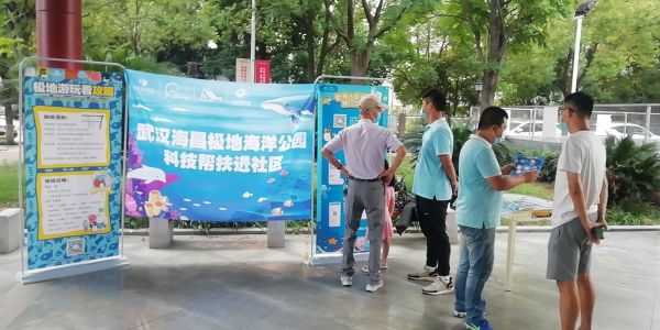 本次惠民服务进社区活动,主要宣传惠游湖北活动相关信息,现场指导不会预约的老人、小孩预约,并向居民科普极地海洋知识,让他们进一步了解极地海洋风采。