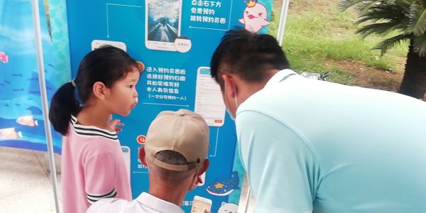活动现场,工作人员向居民发放景区预约门票流程宣传页并耐心解答他们的问题。不少居民驻足了解情况。也有不少小朋友在争先提问:“海洋馆里有什么动物?”“海狮海豹有什么不同?”“暑假了,女儿和女婿要上班,宝宝在家关不住,只能天天带着去公园、马路旁边转悠。”孙爷爷在工作人员的帮助下,学会了用手机预约免费景区门票,他高兴地说:“这下可以带宝宝去极地馆看北极熊了。”