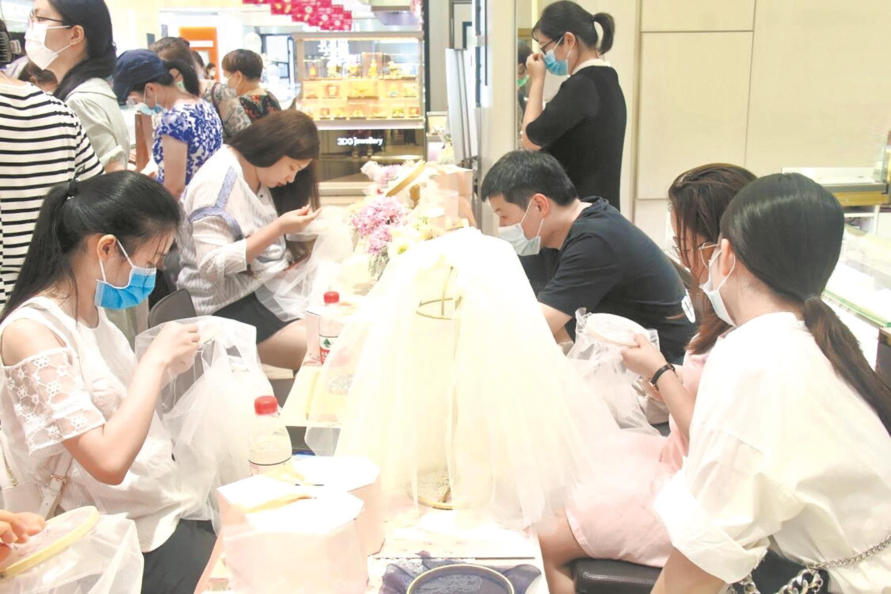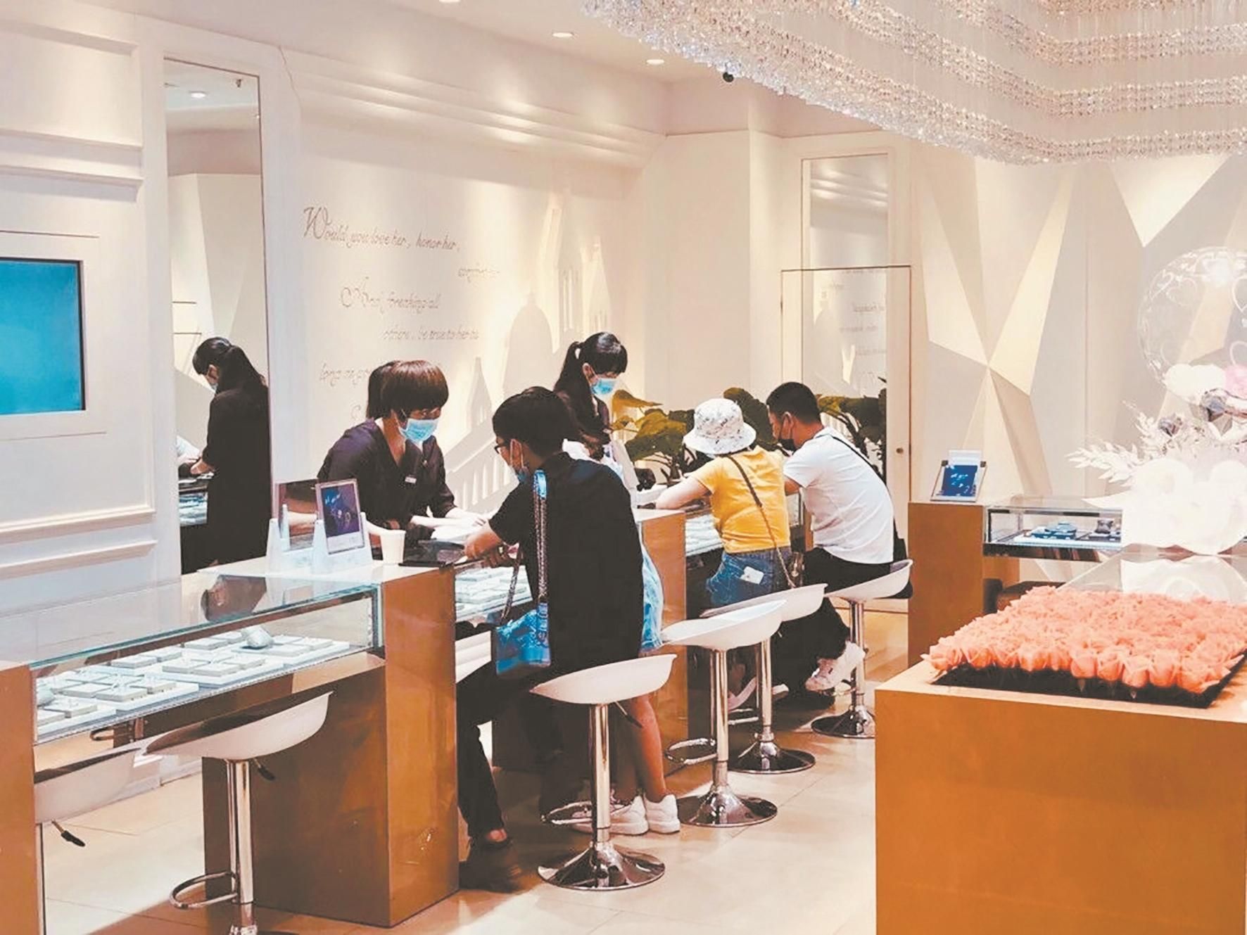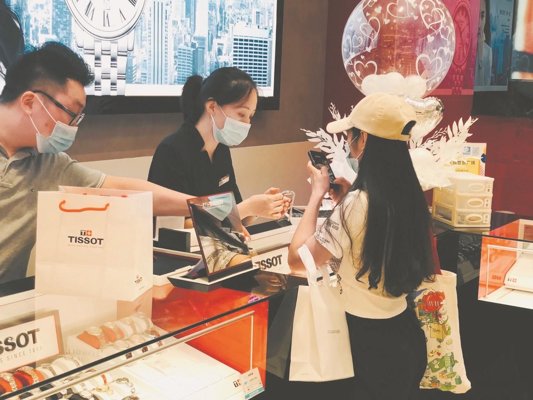 在名表专柜,一名男士很快挑选了一只折后11万余元的女表。他告诉记者,之前逛街老婆就看中了这款手表,但觉得贵没舍得买,“今年是我们结婚20周年,我也要向年轻人学习,把生活过得更有仪式感一点。”