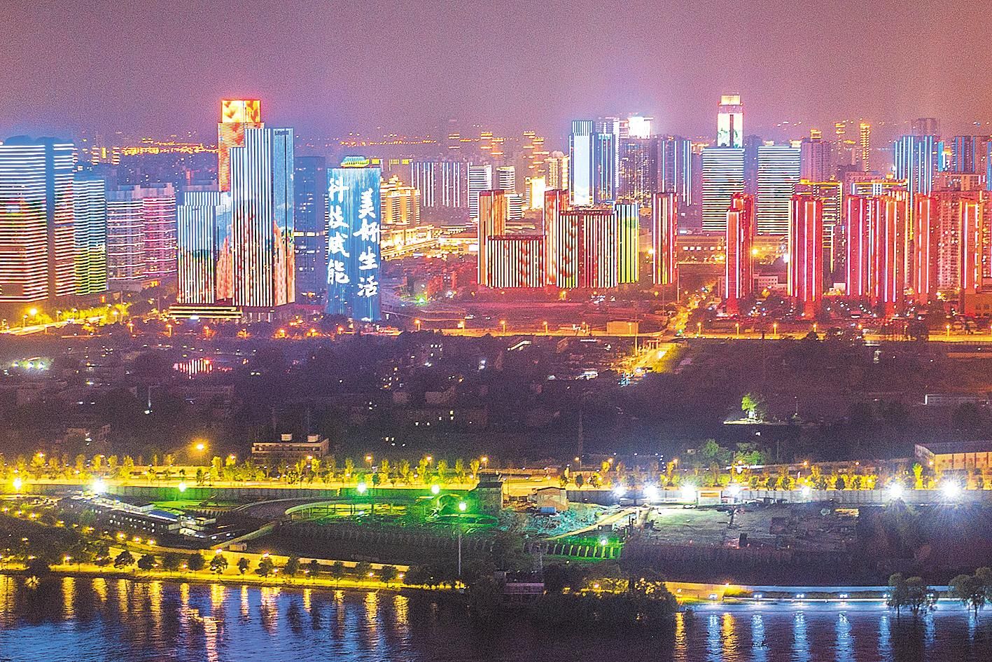 8月23日晚,武汉两江四岸点亮全国科技活动周“湖北分会场”灯光秀,“科技赋能 美好生活”的大字投映在武汉长江两岸的楼宇上,璀璨夺目。(湖北日报全媒记者 梅涛 摄)