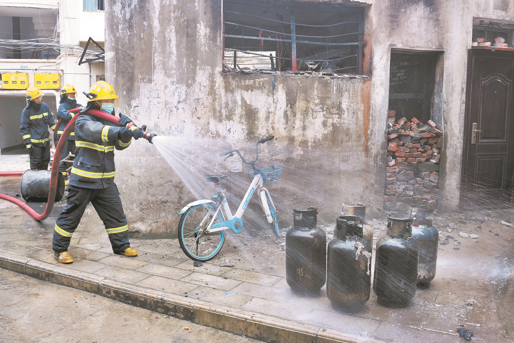 消防员给煤气罐浇水降温