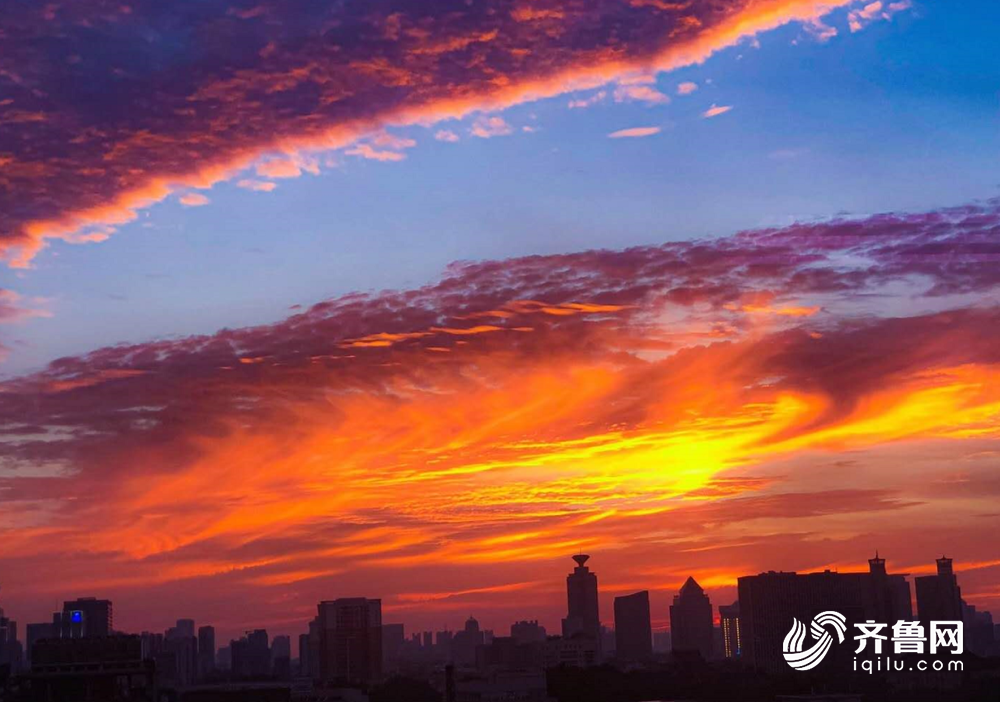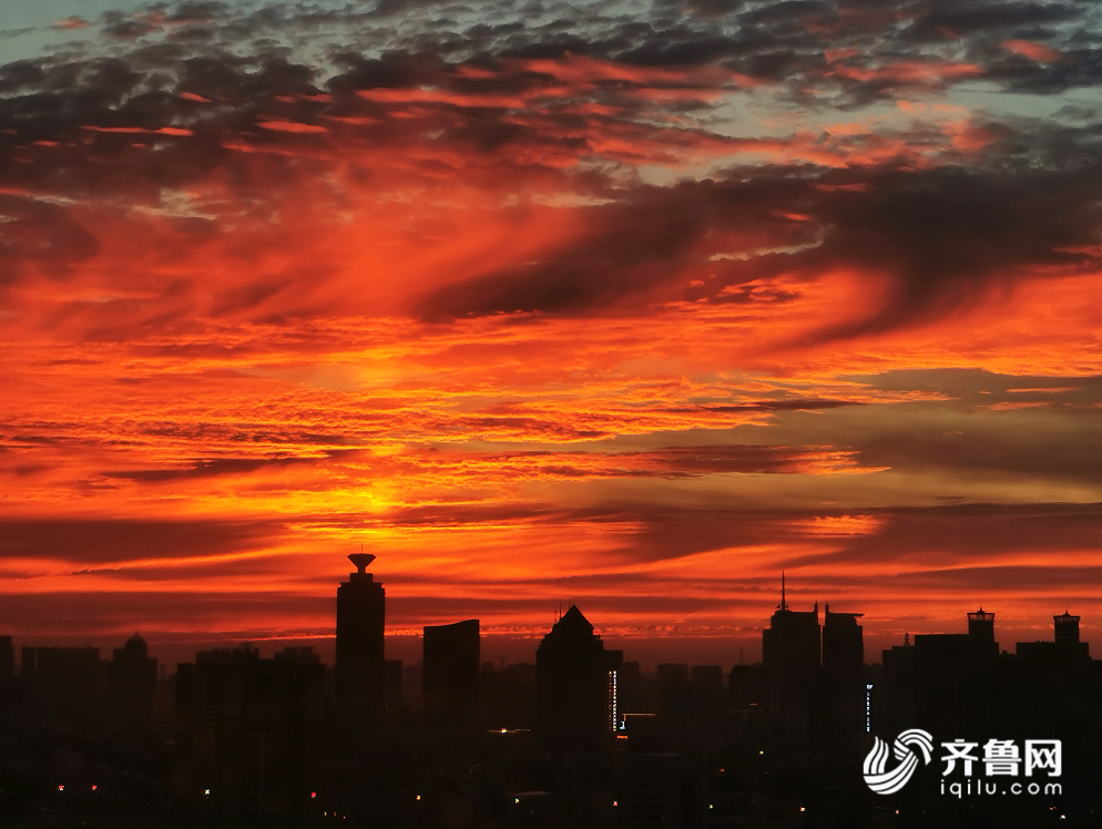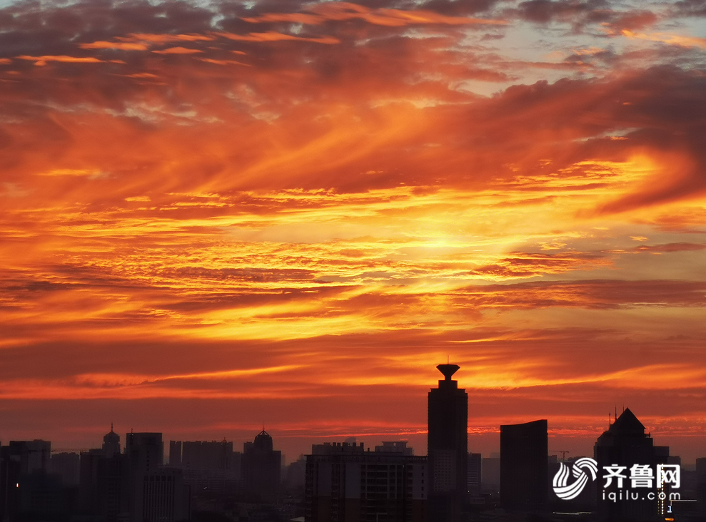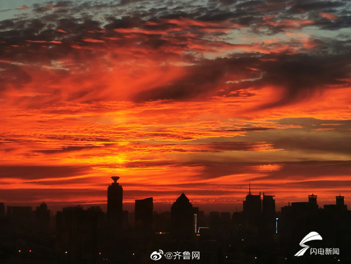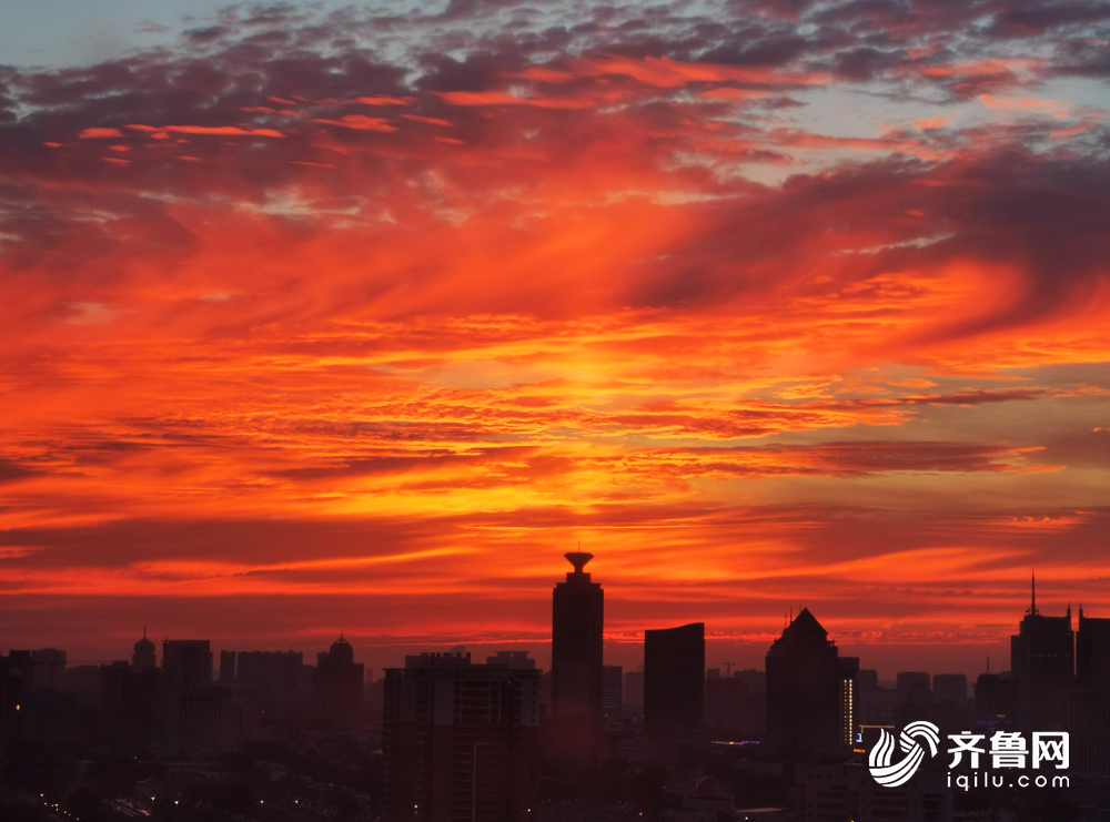 8月24日傍晚,济南出现壮丽的火烧云景观,西落的太阳像巨大的火球,把浮云染成了红色,神奇而美丽。