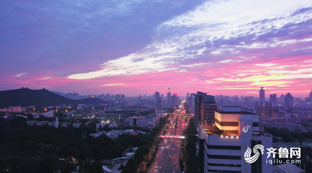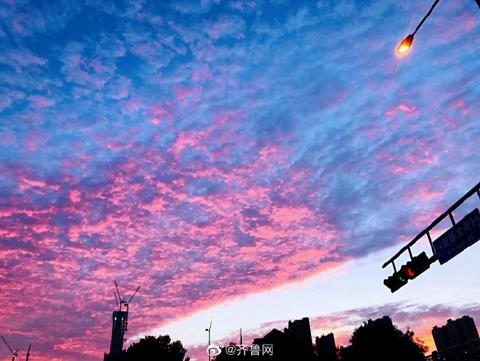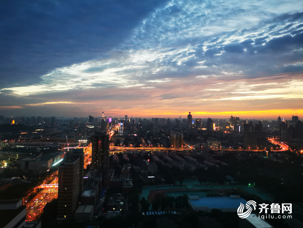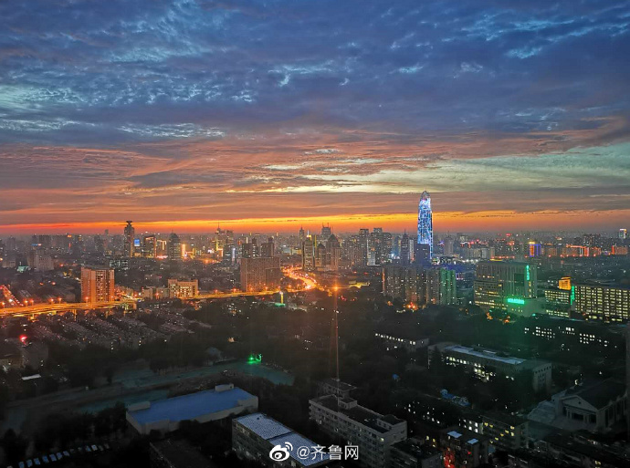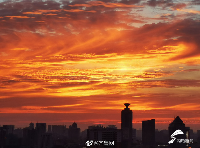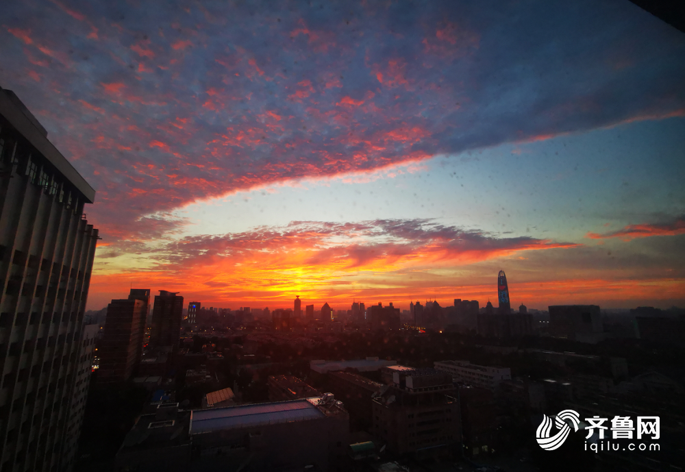 8月24日傍晚,济南出现壮丽的火烧云景观,西落的太阳像巨大的火球,把浮云染成了红色,神奇而美丽。