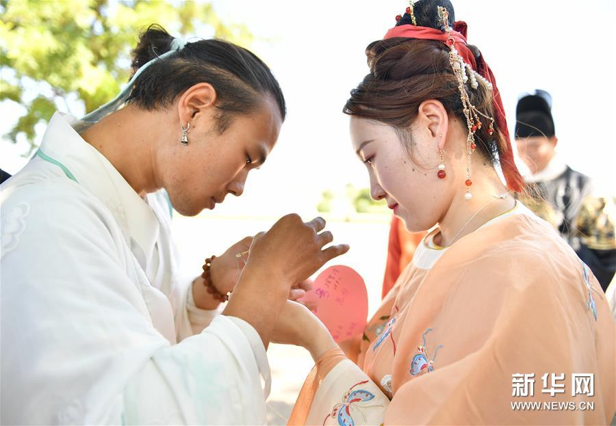 8月25日,年轻人在西安大明宫国家遗址公园七夕节活动现场展示传统服饰。新华社记者 张博文 摄