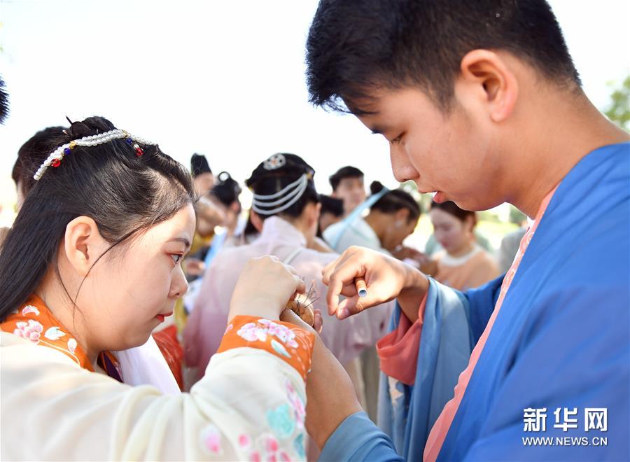 8月25日,身着传统服饰的年轻人在活动现场体验“穿针乞巧”。新华社记者 张博文 摄