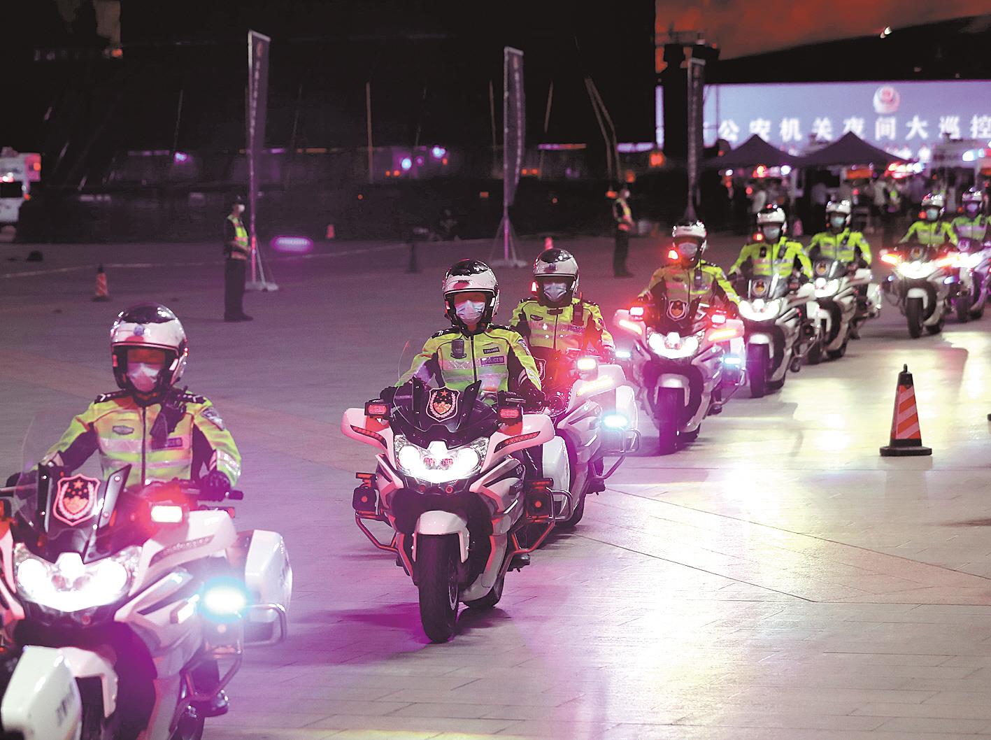 8月26日,武汉市公安局在武昌首义广场举行全市公安机关夜间大巡控启动仪式。当晚,全市设置夜间巡逻线路347条、驻巡点366个,投入夜巡警力4900余人、巡逻车1000余台。警方将对夜市、商圈、江滩公园等夜间人员聚集的重点部位加强巡查, 进一步提高街面见警率、管事率和“135”快速反应圈应急处突攻坚能力。(视界网 赵军 应后威 摄)