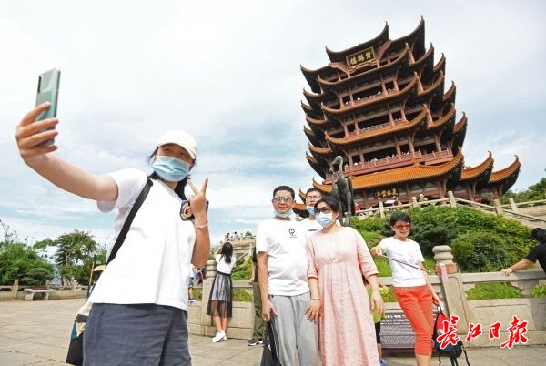 8月25日,武汉黄鹤楼公园,外地游客徐先生一家四口在黄鹤楼前拍照留影。 记者詹松 摄