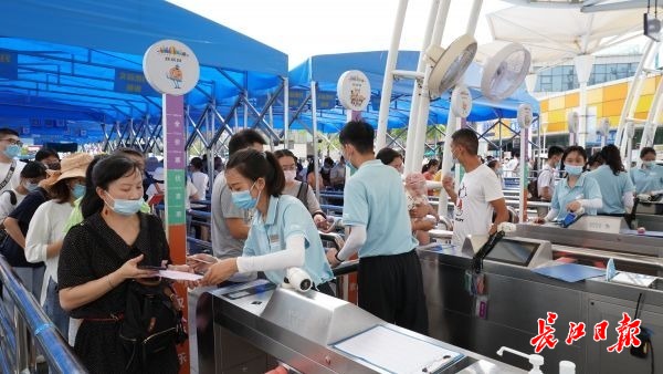 欢乐谷门口长长的队伍,游客多从江西、广东等地赶来。万先生一家来自河南驻马店,“我们前几天预约过,没成功。昨天又试,一试就中了”。记者在黄鹤楼随机采访多位游客,也都来自外省市。
