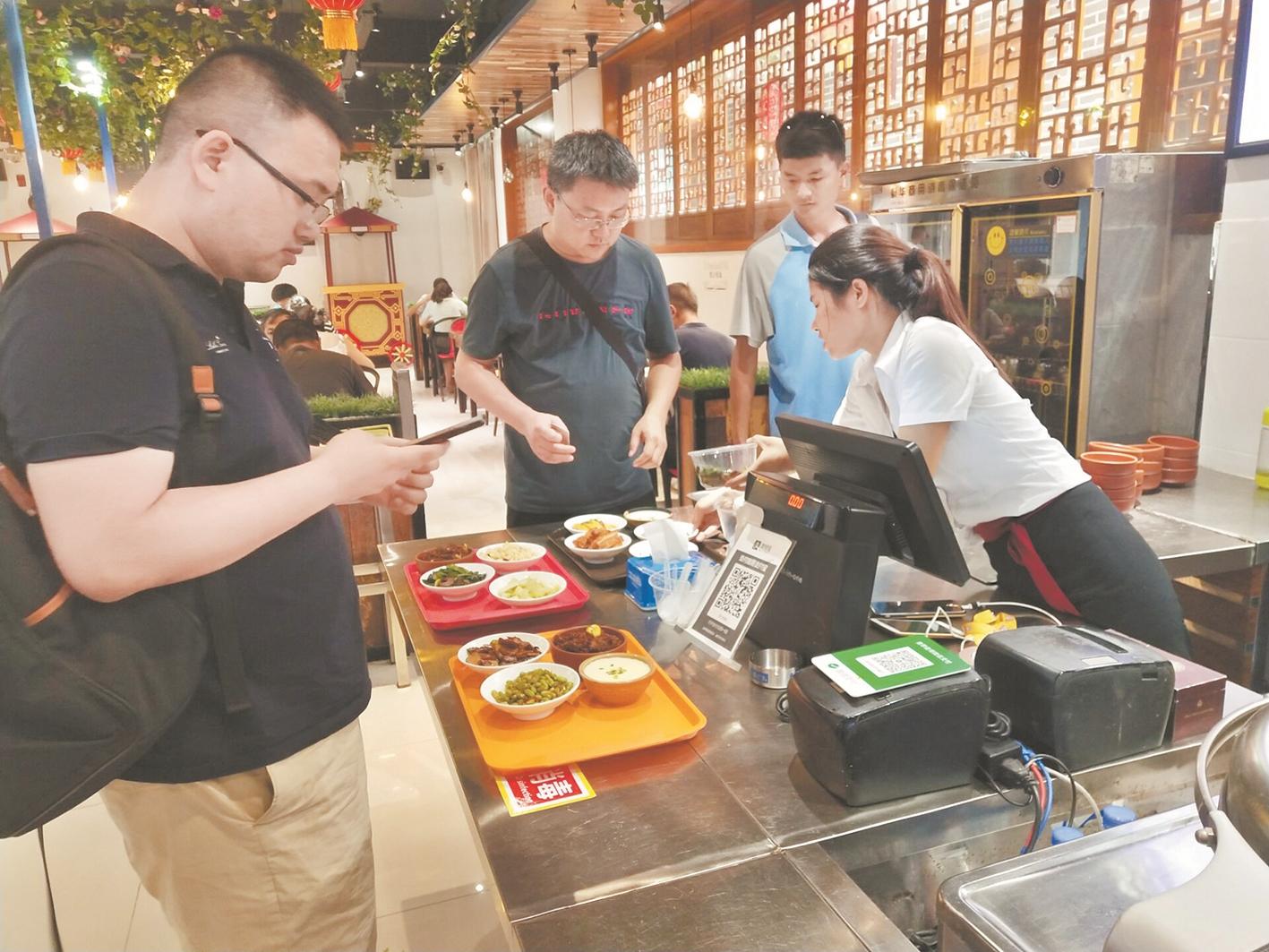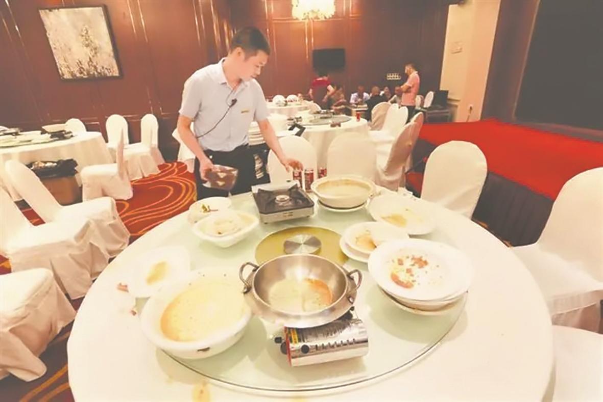 8月21日晚7时许,三峡环球港3楼某餐厅内,顾客几乎满座,客人大多点一个火锅和几道配菜。在已吃完离开的客人餐桌上,多数菜品均已“光盘”,只有少数几个盘中有汤汁、辣椒等佐料被剩下。