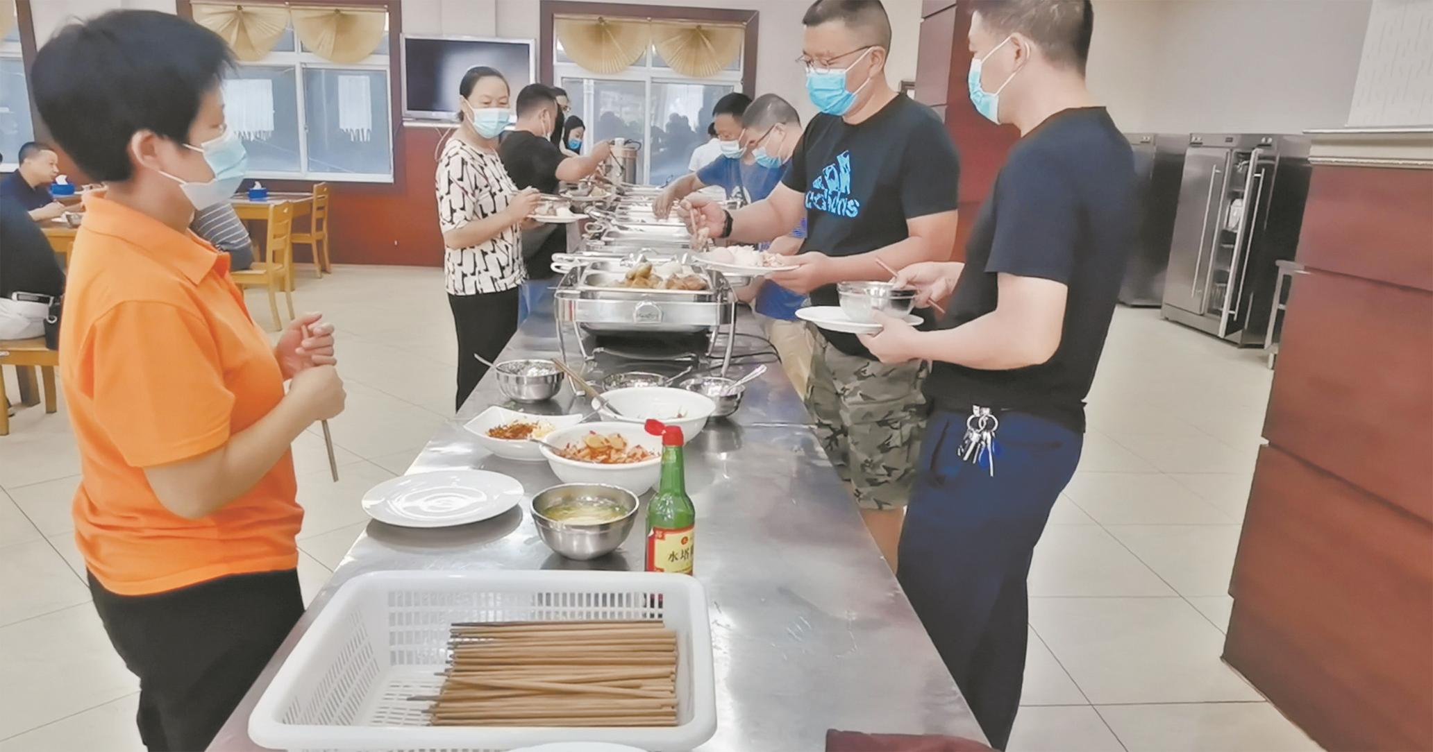 8月25日早上8时,记者来到恩施市政府院内的职工食堂,上班的人陆续来此吃早餐。大家戴着口罩,在入口处的自动仪器前测体温,然后拿起餐盘取餐。当日的早餐有面条、炒豆皮,配鸡汤臊子,小点心有馒头、酥饼、水煮蛋等。一碗面条的分量不算很多,刚刚装了半碗,饮料只有豆浆。进餐者每次取的食物都不算多,不够吃再去取。