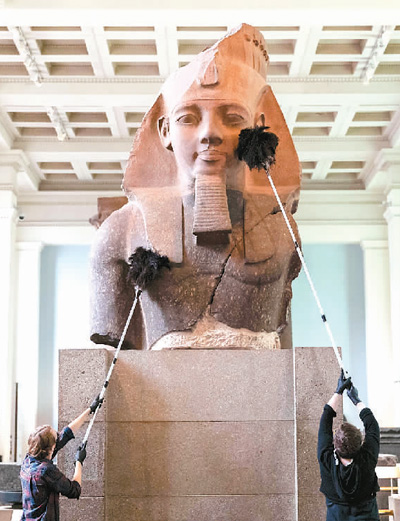 图为8月25日,工作人员在大英博物馆举行的媒体预展上将展品上的灰尘掸掉,为博物馆重新开放做准备。