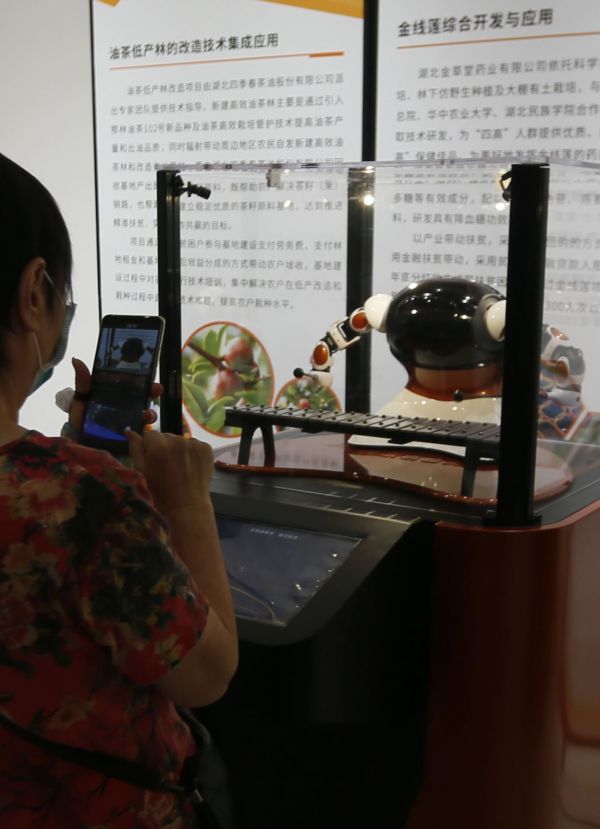 武汉科技馆“流动科技馆”展览的“琴、棋、书、画”机器人表演。
