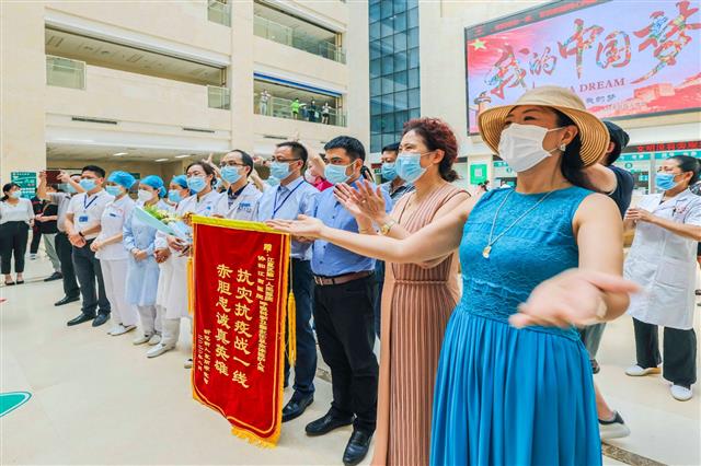 袁丽琼说,出院前,她曾向廉海容“许诺”,等山花烂漫时,一定会去看望他。8月10日,袁丽琼带着姐妹团赶赴无锡实现了承诺。今天,她的姐妹团也一起来到医院,为家乡的白衣天使们表演一曲名为《我要谢谢你》的手指舞。