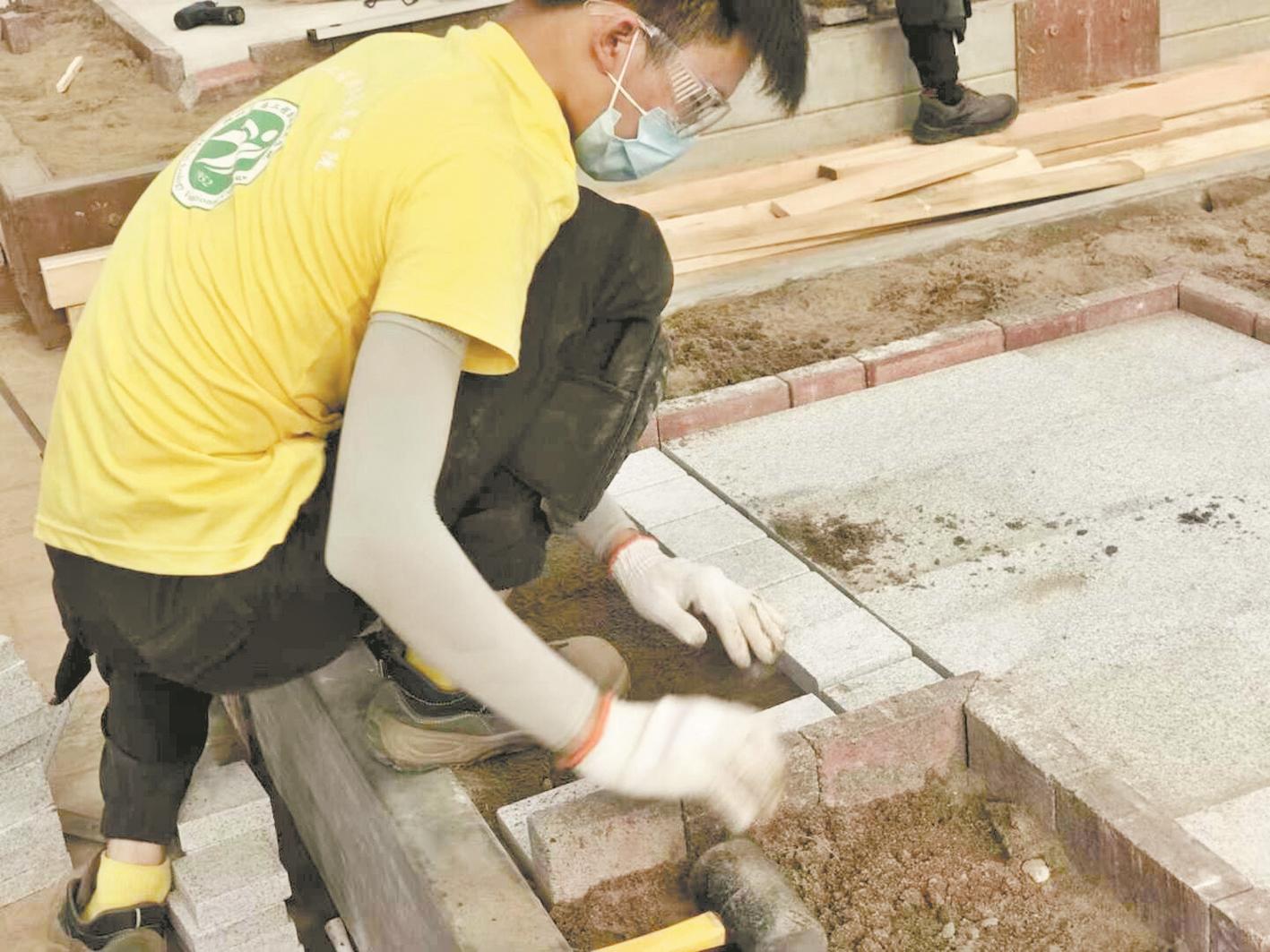 张定学介绍,水景中的干垒石墙,是五大模块中耗费时间最久且体力消耗最大的一个项目。4个小时的赛程中,张定学搬了几百块石头。大赛评分标准要求控制墙体长度、宽度、高度在0-2mm内。”