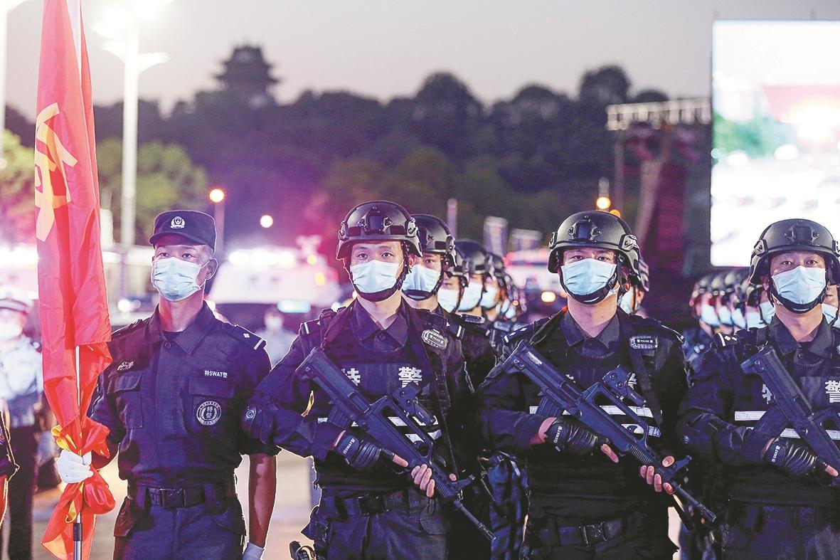 8月26日晚8时,武汉首义广场上红蓝警灯闪烁。“枭龙”、“剑齿虎”装甲车,“霸道”巡逻车,智能巡控车,“汉警快骑”摩托车列阵待发。武汉市公安局各直属单位负责人组成警官方阵,以及机关民警、交警、特警、巡警、辅警组成的5个方阵,一队队民警威武肃立。